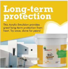 Ready to use cool roof paint. Primarily used for exterior roof or vertical surfaces, facades. Reflects sunlight to a greater extent and prevents the roofing materials from getting heated up even in peak summer afternoons. Works on the principle of continuous rejection of UV and IR rays. The surface itself is not getting heated up, so the air below the surface never gets hot, keeping the rooms cool and comfortable. As a result, effective power saving of up to 40% during peak summer.